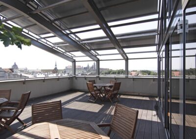 - Osłona tarasu i wnętrza budynku redukuje nagrzewanie się pomieszczeń.