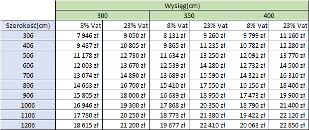 szerokość (wzdłuż ściany) 300 – 1200cm x wysięg (od ściany do słupa) 300 – 600cm