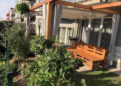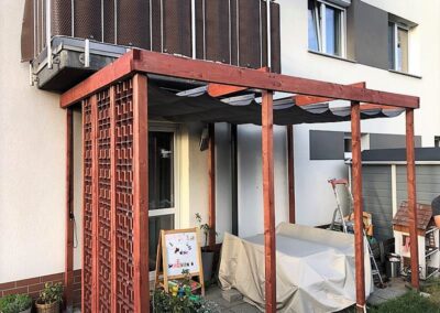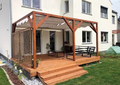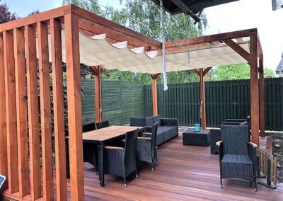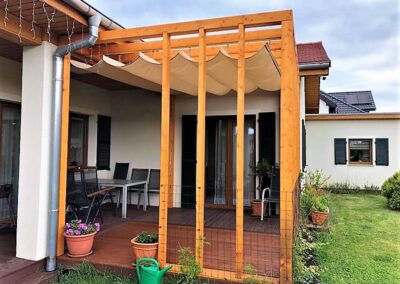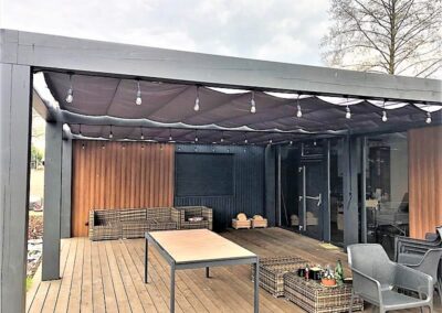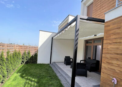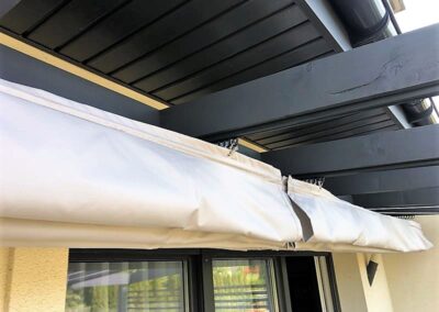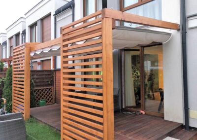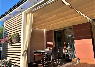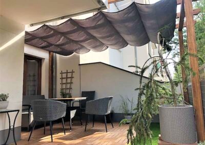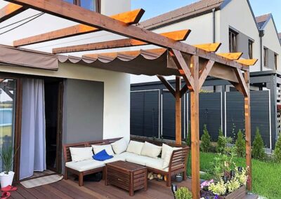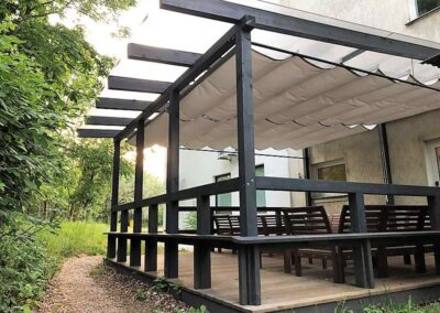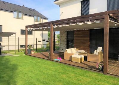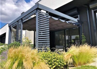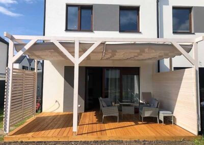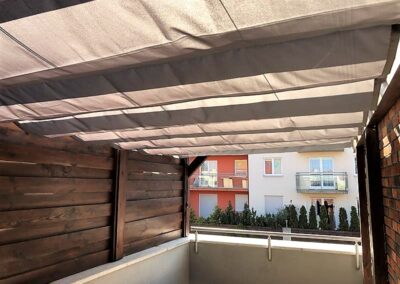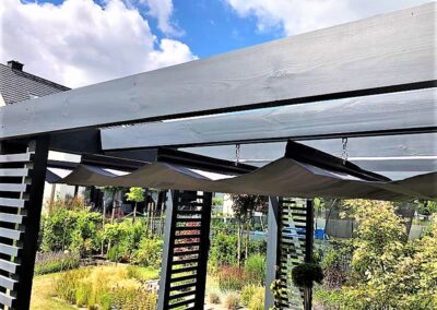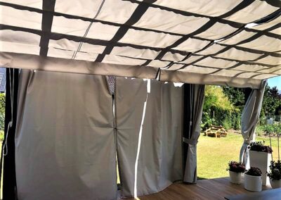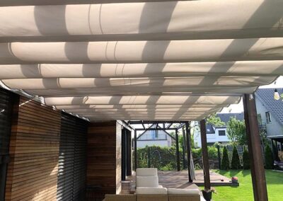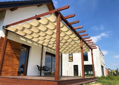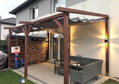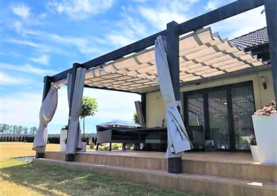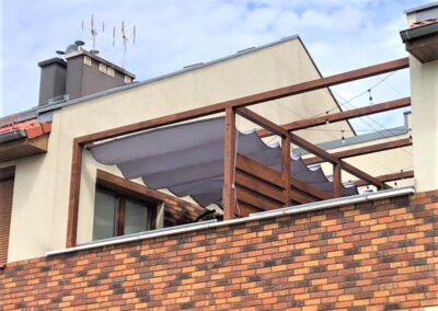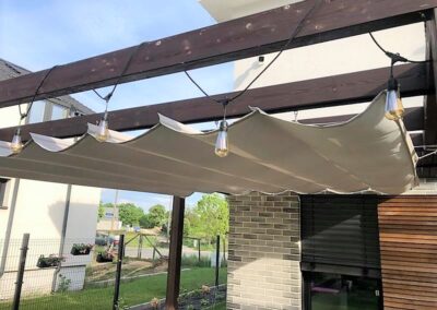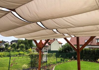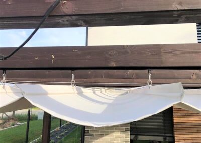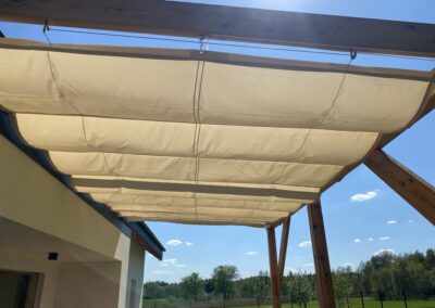 Zadaszenie tkaninowe do gotowych pergoli wykonane jako roleta rzymska pozioma.